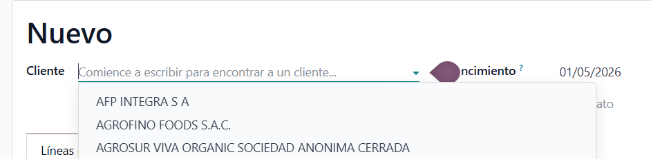 Si el cliente no existe en el sistema, se puede crear directamente desde este campo.