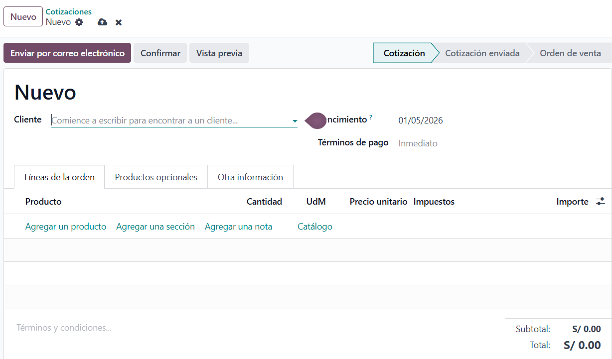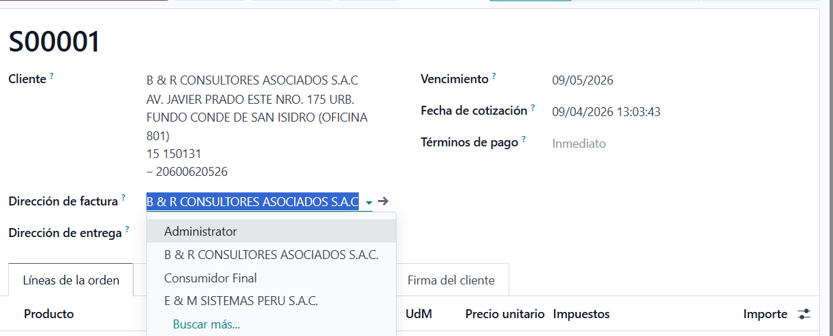 En el campo Cliente, seleccionar el contacto al que se enviará la cotización.