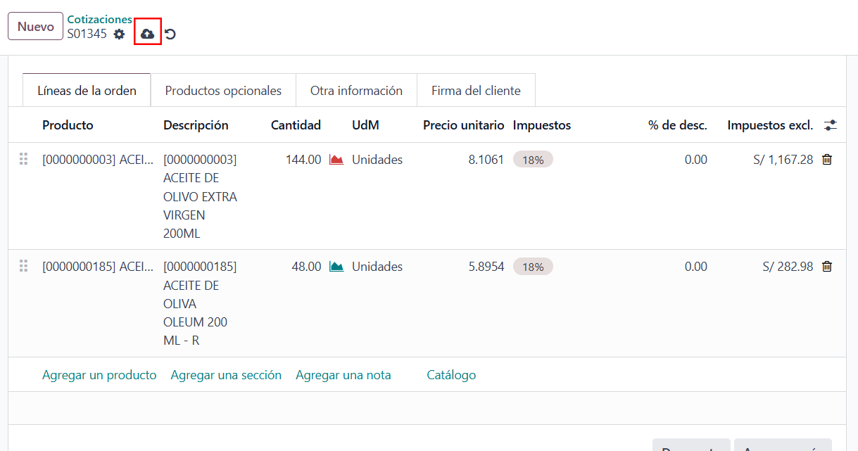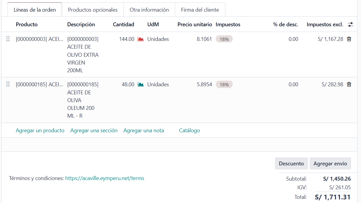 En la sección Líneas de pedido, hacer clic en Agregar un producto.